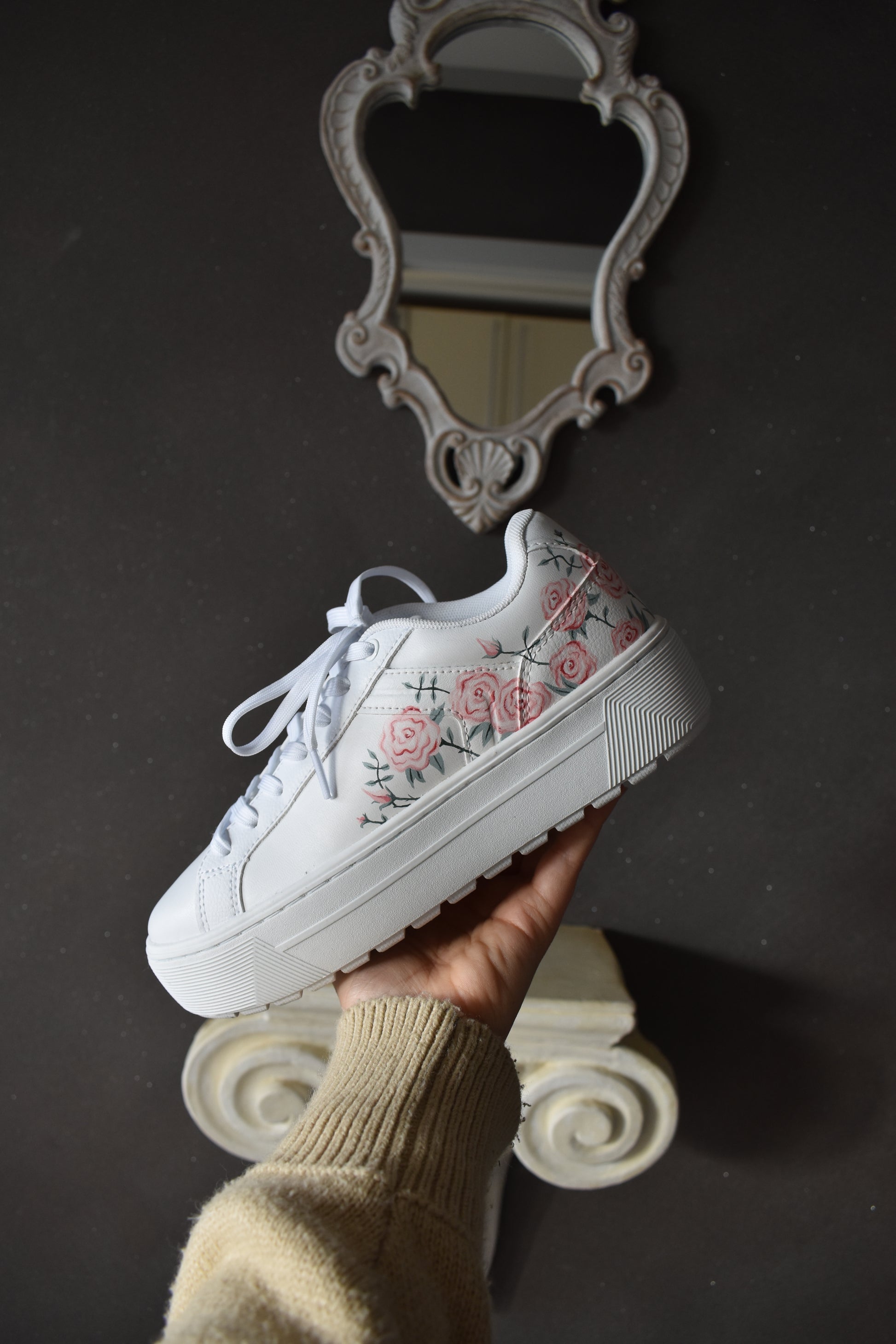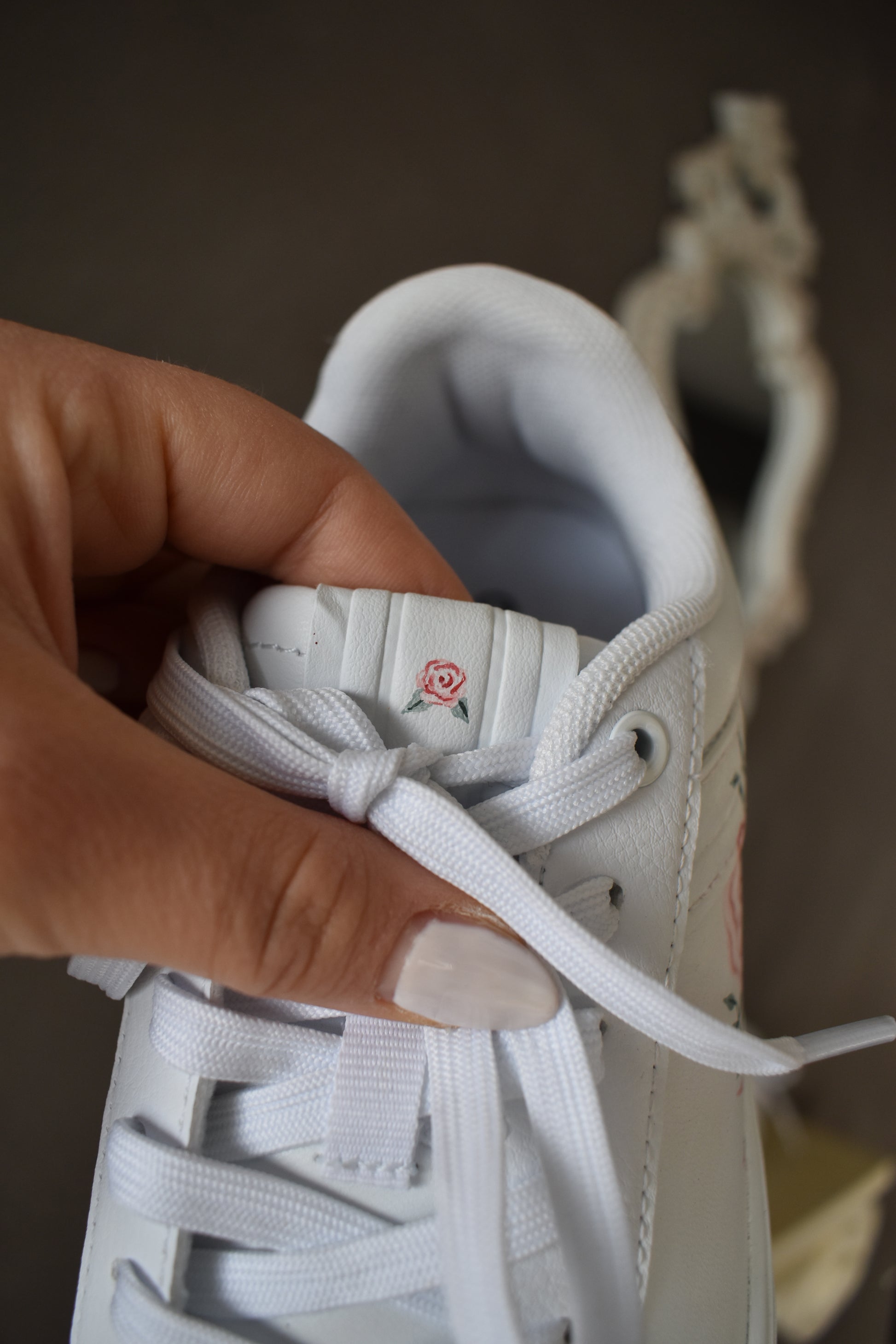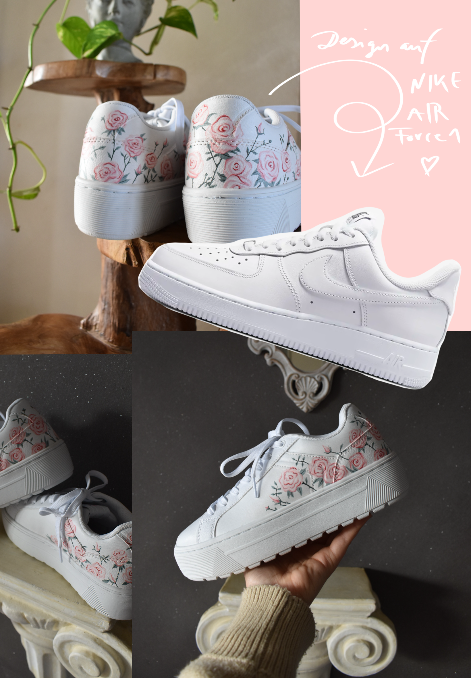 Dieses Design wird auf einem Nike Air Force 1 angewendet, kann daher Abweichungen zu gezeigten Bildern aufweisen. Bsp.: Die kleine Mini-Rose wird unterhalb der Schnürung angesetzt.